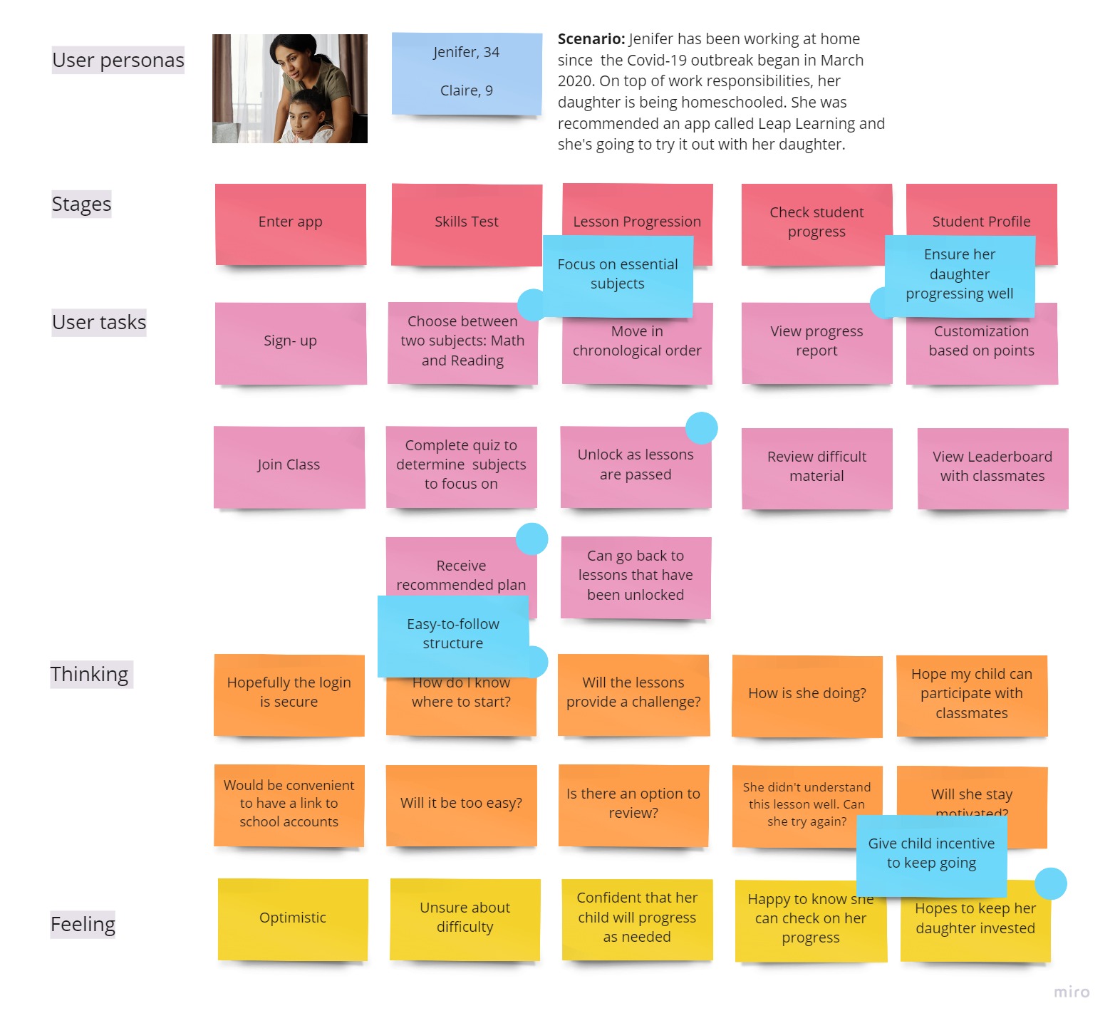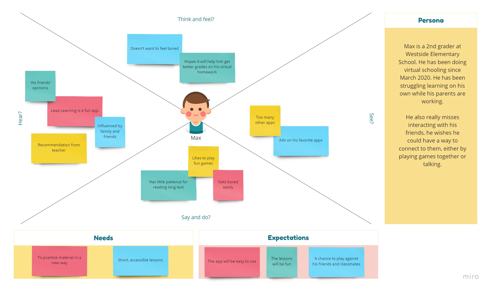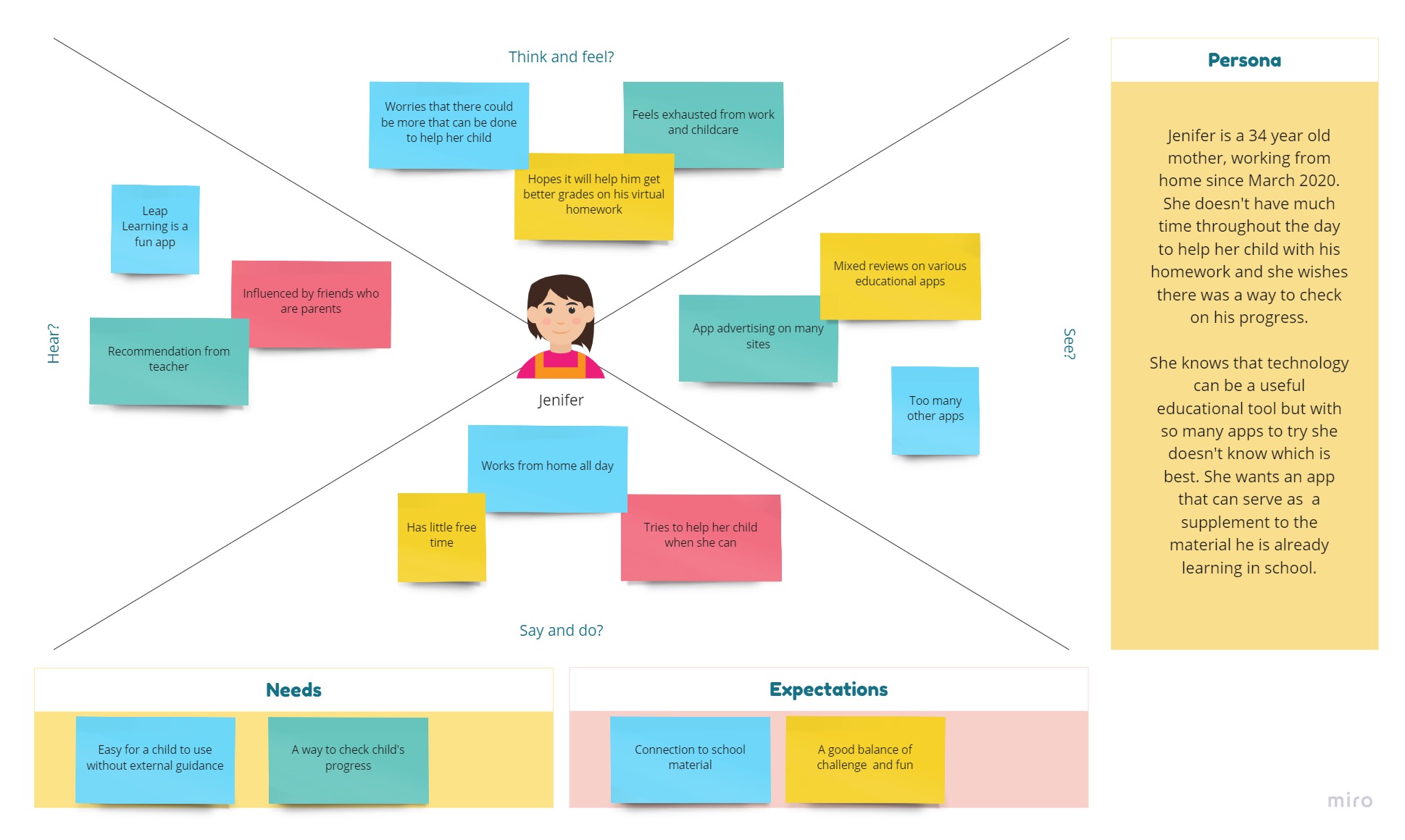 Empathy-persona map for a child who would use the app and a mother struggling with virtual school for her child.